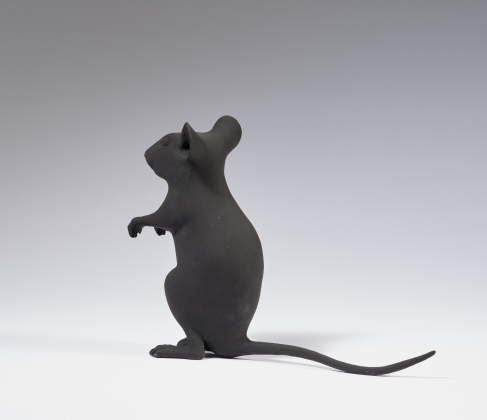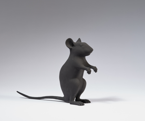 Katharina Fritsch fertigt Skulpturen, die alltägliche Objekte nachbilden, wobei die Figuren in ihren Dimensionen zwischen Miniatur und Überlebensgröße changieren. Indem sie die Größe und Farbe dieser Objekte manipuliert und sie in unerwarteten Kombinationen arrangiert, destabilisiert sie das Vertraute. So auch in der Darstellung der schwarzen Maus. Fritschs akribische Herstellungsprozesse, die nahezu industrielle Perfektion erreichen, umfassen Skizzen, handgefertigte Modelle, die in Abgüsse übersetzt werden und schließlich eine Beschichtung mit stark gesättigter matter Farbe erhalten, die den für sie typischen Jenseits-Effekt erzeugt. Bei der Maus-Edition wurde die hochpigmentierte Acrylfarbe auf einen Kunststoffträger aufgebracht. Durch die farbliche Verfremdung verliert die Maus ihren individuellen Charakter und erscheint somit als rätselhaftes Artefakt.