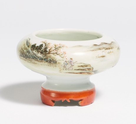 KLEINER PINSELWASCHER MIT LANDSCHAFT, AUF HOHEM SOCKEL.