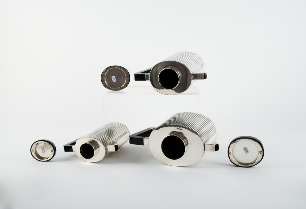 Formensprache wie die Henkel gestaltet. Die Deckel jeweils mit Bajonettverschluss, die