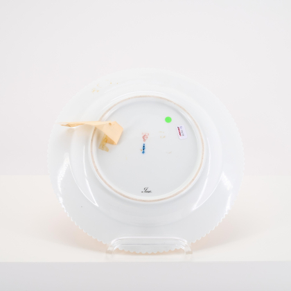 Die in qualitätvoller Miniaturmalerei ausgeführten Teller dieser Folge (siehe auch Lose 556, 557 und 559) zeigen unterschiedliche Orte von Thüringen und ihre Wahrzeichen mit topografischer Genauigkeit. Trotz der leichten Variation des Goldornaments auf der Fahne stammen sie zweifellos aus einem Service. Es sind keine Quellennachweise weder über den Auftraggeber noch zum Anlass der Bestellung der Teller überliefert worden. Drei weitere Teller mit identischer Form mit Ansichten von Altenstein, Meiningen und Bad Liebenstein befinden sich in Twinight Collection, New York. Die Autorschaft der grafischen Vorlagen für die Teller wird dem Landschaftsmaler August Wilhelm Ferdinand Schirmer zugeschrieben.