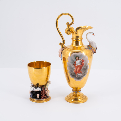 Beschreibung: Prunkkanne mit Schwanendekor, allegorischen Szenen und Satyrapplikation am Henkel. Dazu
