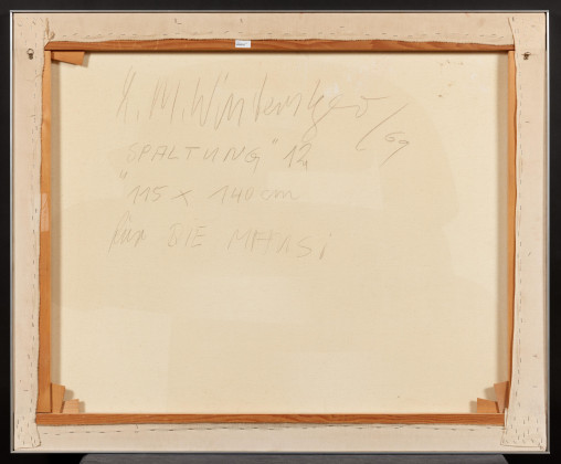 Bezeichnung: Signiert, datiert und betitelt verso oben: L.M. Wintersberger /69 "SPALTUNG" 12. Hier zudem mit Maßangaben und Widmung versehen.