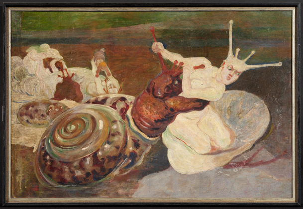 In den Jahren um 1903 beschäftigt sich Leo Putz in verschiedenen Vorstudien und Zeichnungen mit dem Thema des Schneckenkampfes, das schließlich in der Veröffentlichung des Gemäldes in der Zeitschrift "Jugend" von 1904 mündet (WVZ.Nr. 1370). In diesen Szenen des verschlungenen erotischen Ringens schafft Putz vermenschlichte Zwischenwesen und zeigt den ewigen Kampf von Dunkel gegen Hell. Die hier vorliegende unsignierte Ölstudie ist sehr nah an der Nr. 1370, allerdings in einzelnen Elementen wie z.B. der dunkeln Figur links im Hintergrund nicht komplett ausgeführt. Daher ist davon auszugehen, dass es sich bei der hier vorliegenden Arbeit um eine der Ölstudien in Vorbereitung des veröffentlichten Gemäldes handelt.