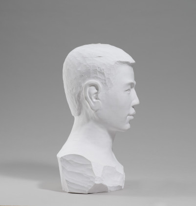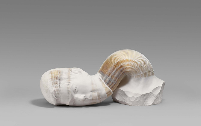 Die Skulptur mutet auf den ersten Blick wie eine Gips-Skulptur an, doch sie besteht aus Papier und kann im Ziehharmonika-Prinzip in verschiedene Positionen auseinandergezogen werden.