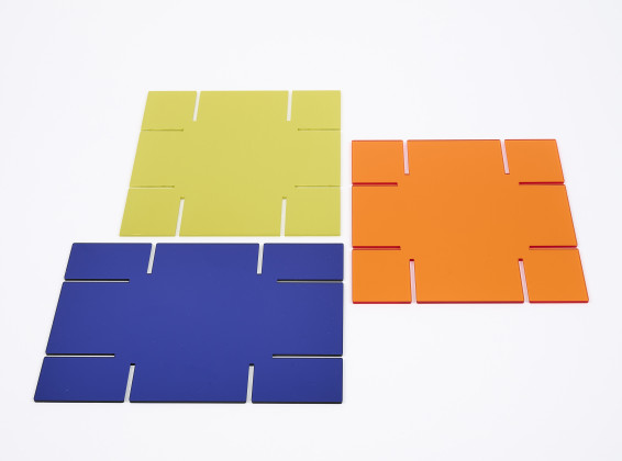 Technik: 5 farbige Plexiglasplatten und 3 farbige Aluminiumplatten, variabel zusammensteckbar.