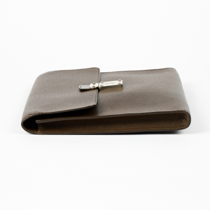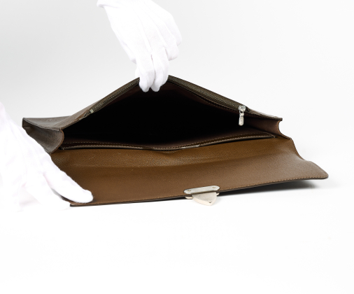 Material: Braunes Leder, silberfarbene Metallelemente.