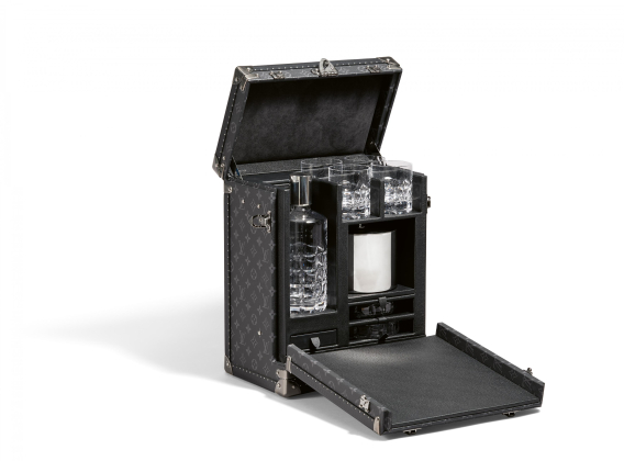Beschreibung: Eleganter tragbarer Bar Koffer mit hochwertiger Innenausstattung.