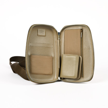 Beschreibung: Umhängetasche mit verstellbarem Schulterriemen. Verschiedene flache Innenfächer. Anbei kleines Portemmonaie und Schlüssel.