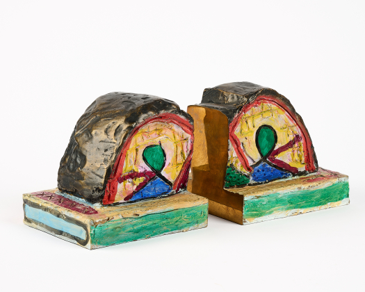 Technik: 10 von Künstler gestaltete Lexikonbände und zwei Buchstützen aus Bronze, teilpoliert und farbig gefasst.