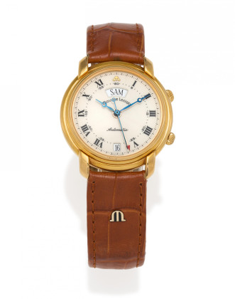 Beschreibung: Maurice Lacroix Alarmwecker mit Wochentagsanzeige bei "12" Uhr und Datumsanzeige bei "6" Uhr. Gehäuse mit gewölbten Glas. Gehäuseboden mit Sichtglas. Zwei Kronen, zum Stellen für die Uhrzeit und Datum sowie den Alarmzeiger.