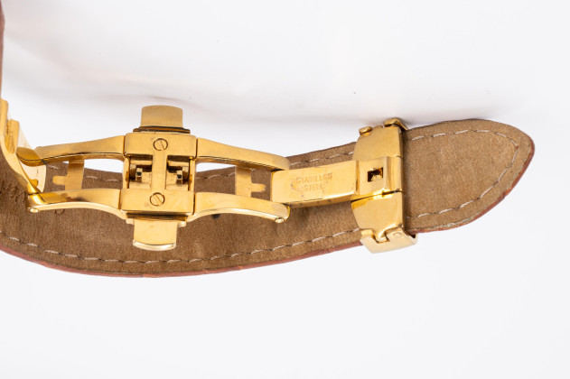 Gehäuse/Armband: Stahl, vergoldet, Lederarmband mit doppelter Faltschließe, Zffbl. crème-farben guillochiert, römische Ziffern schwarz, Zeiger roségolden und gebläut.