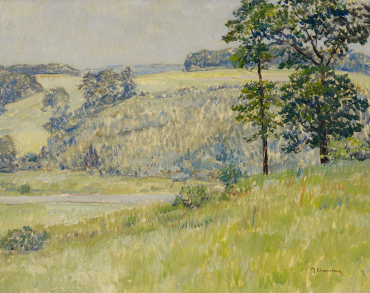 So zeigt Los 1252 eine hügelige Wiesenlandschaft in zarten Grün- und Blautönen. In impressionistischer Manier setzte Clarenbach die Pinselstriche wellenförmig beziehungsweise in kleinen senkrechten Strichen auf die Leinwand und schafft so eine stimmungsvolle Sommerlandschaft, die - wie seine charakteristischen Darstellungen der Winterlandschaft - eine ganz eigene Ruhe ausstahlt. Gleichzeitig werden hier die Einflüsse der Freilichtmalerei der französischen Impressionisten deutlich, mit denen Clarenbach sich in den ersten beiden Jahrzehnten des 20. Jahrhunderts auseinandersetzte und intensiv beschäftigte.