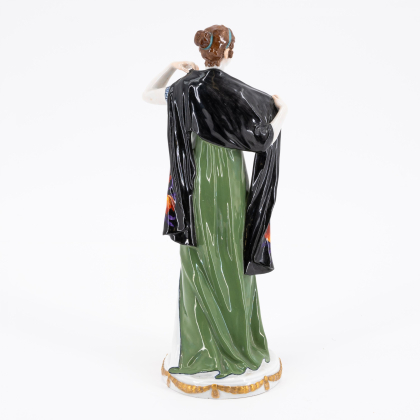 Beschreibung: Auf ovalem Sockel eine schreitende Dame in Abendkleid, die sich eine mit Blumen dekorierte