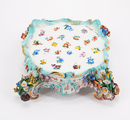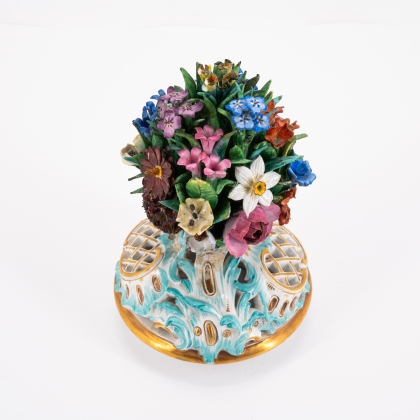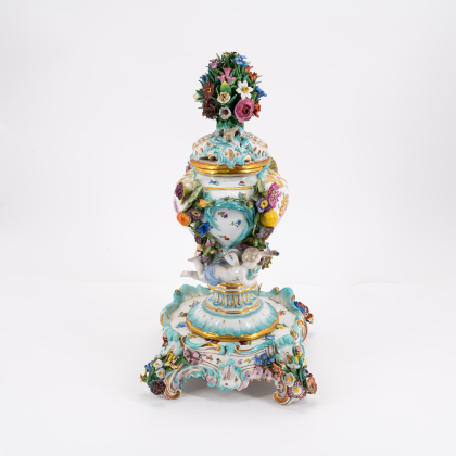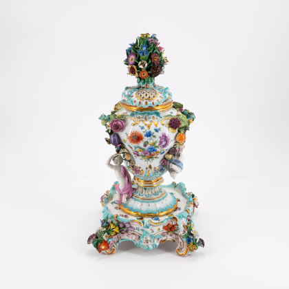 DREITEILIGE POTPOURRI-VASE MIT AUFGELEGTEN BLÜTEN UND PUTTENZIER.