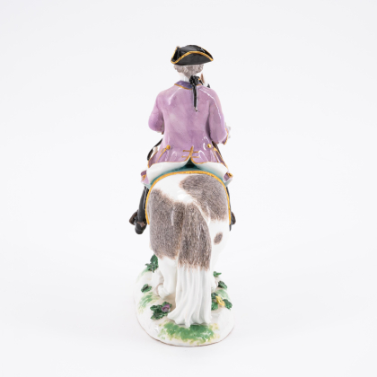 sitzend ein Reiter mit Dreispitz, violettem Rock und Degen an der Hüfte. In der einen Hand