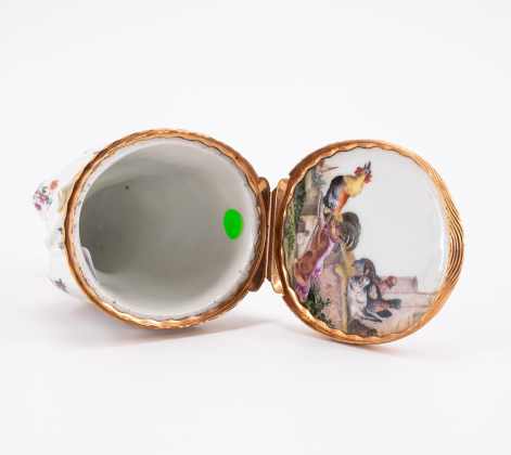 Technik: Porzellan, farbig staffiert, gold dekoriert. Kupfermontierung, vergoldet.