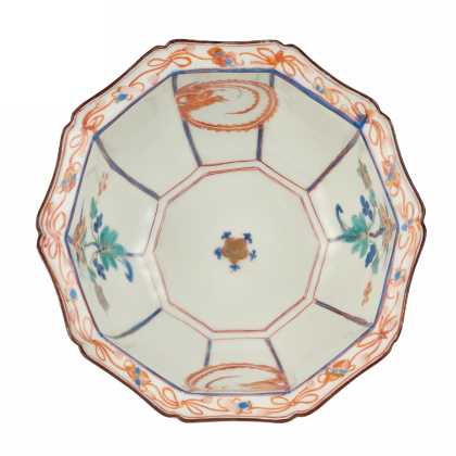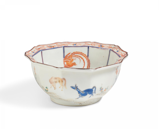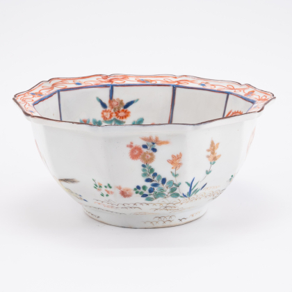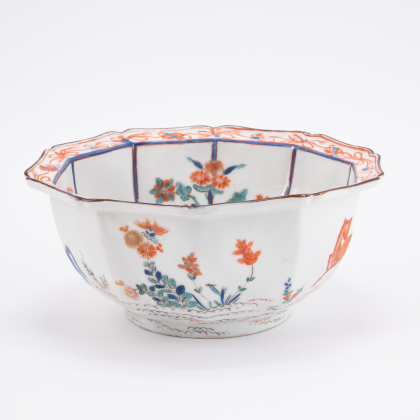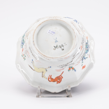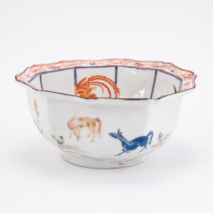 Beschreibung: Zehneckige Spülkumme mit ausgestelltem und leicht geschwungenem Rand mit zehn Einschnürungen. Die Bemalung in den Farben der japanischen Arita-Porzellane nach Sakaida Kakiemon. Auf der Wandung der schönen Kumme jeweils ein Pferdepaar zwischen indianischen Blumen und auf dem unteren Wandungsdrittel eine umlaufende, stilisierte Weidelandschaft. Die Innenseite ist durch blaue Rahmen in zehn Segmente unterteilt, die gegenständig von je zwei Phönixvögeln und zwei indianischen Blumensträußen unterbrochen werden.