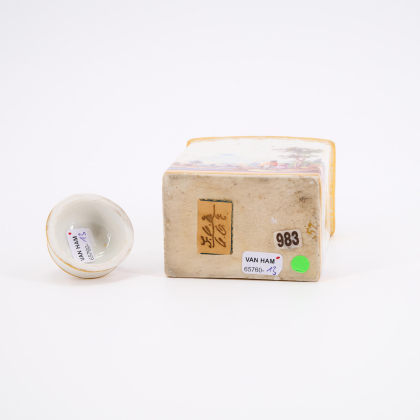 Beschreibung: Rechteckiger Korpus mit gerundeter Schulter, darauf Blumendekor. Umlaufende, fein gemalte Kauffahrteiszenen. Unten mit roter Doppellinie abgeschlossen. Unterhalb der Schulter Goldspitzenbordüre