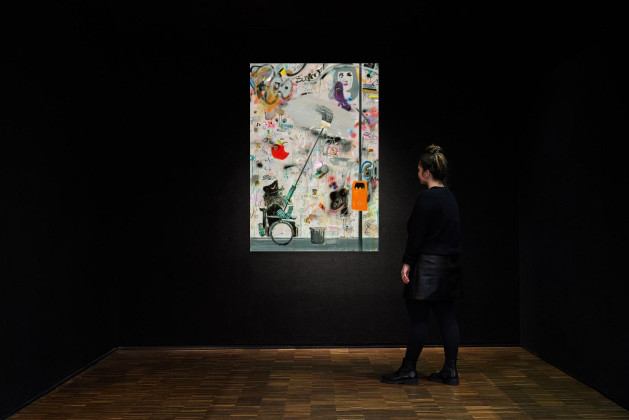 Technik: Öl, Edding und Sticker auf Leinwand.