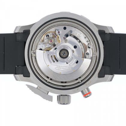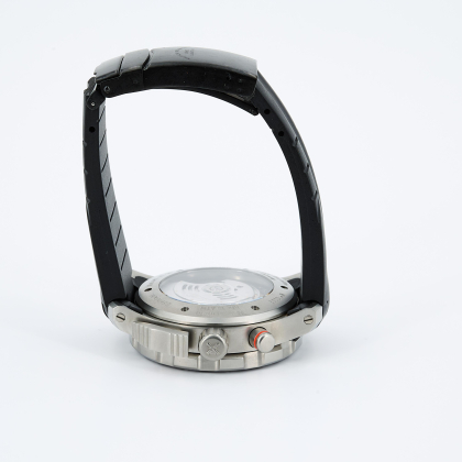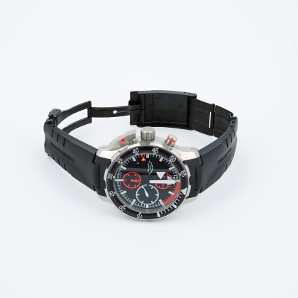 Gehäuse/Armband: Stahl, Kautschukarmband mit Faltschließe, Zffbl. schwarz, Zeiger schwarz und weiß, Indizes weiß, Leuchtmasse.
