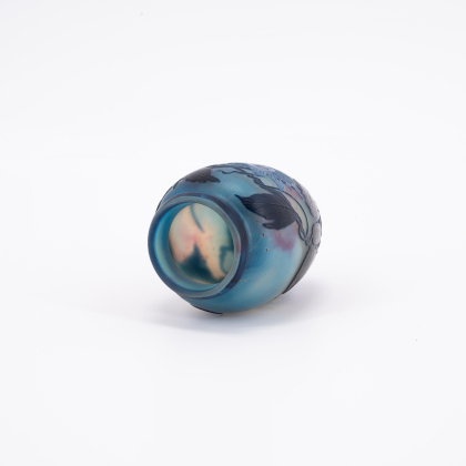 Material: Farbloses Glas, hellblau und lilafarben hinterfangen, Überfang in Blau.