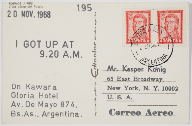 Jeweils: Gestempelte und frankierte Postkarte aus Argentinien. Ca. 9,5 x 14cm. Gestempelt mit dem Namen und Adresse des Künstlers in Buenos Aires, Argentinien (Gloria Hotel), dem Titel, Datum und Uhrzeit der Ausführung sowie dem Empfänger Kasper König, New York. Die Karten wurden ausgeführt im Zeitraum vom 14. - 22. November 1968.