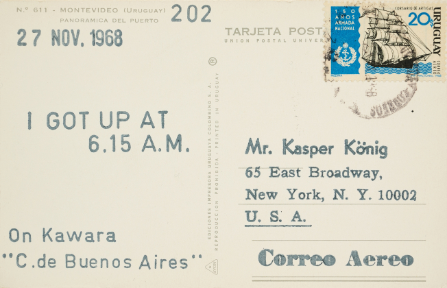 Uruguay) sowie dem Datum und der Uhrzeit, zu der der Künstler an dem Tag aufgestanden war,