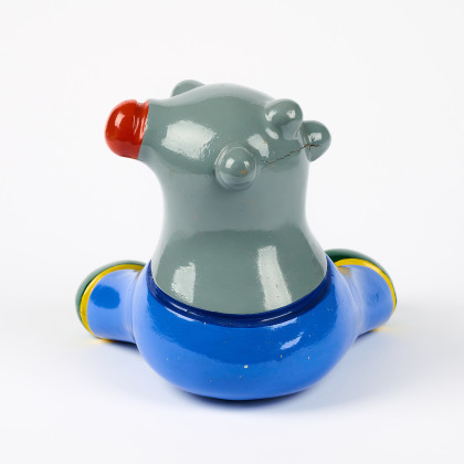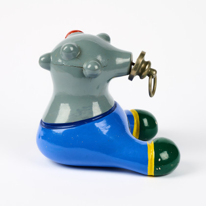 Der Schnuller ist mit einer Schraube befestigt. Die Schraube ist locker. Punktuell leichte Bereibungen mit kleinen Farbverlusten, vor allem an den Füßen und am Gesäß. Risse am Kopf (von ca. 0,5cm Länge bis ca. 8cm Länge). Vereinzelt kleine Farbspritzer oder Verschmutzungen. Leichte Korrosion mit einsetzendem Grünspan am Schnuller. Bereibungen an der Unterseite, vereinzelt mit kleineren Farbabplatzungen.