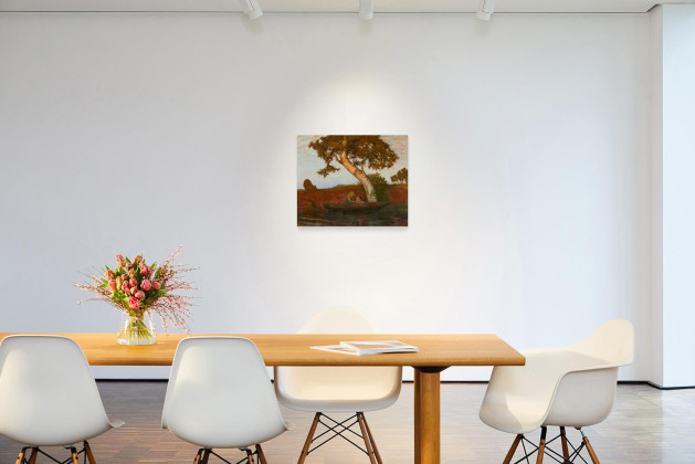 Das vorliegende Gemälde Otto Modersohns zeigt eine karge Moorlandschaft, getaucht in das diffuse Licht der letzten Sonnenstrahlen am Abend. Im Zentrum befindet sich eine kleine knorriger Birke am Ufer eines Gewässers, wie sie typisch sind für die Landschaft rund um Worpswede. Hier gründete Modersohn 1898 gemeinsam mit dem Künstler Hans am Ende die Künstlerkolonie Worpswede. Fasziniert von der rauen ursprünglichen Landschaft und dem einfachen Leben, entstanden hier zahlreiche Gemälde in freier Natur. Trotz aller Harmonie in der Komposition setzt der Künstler leichte Pinselstriche und fängt den Moment der Stille in großer Leichtigkeit ein.