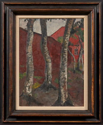 Vor einer roten, den Bildhintergrund weitgehend verstellenden Mauer stehen drei Birken dominierend nah im Vordergrund. Fuß und Stamm der Bäume sind sichtbar, nicht aber ihre Krone. Nur ein paar wenige Blätter sind am oberen Bildrand zu erkennen. Der rot-braun-grau getönte Boden des Geländes fällt zum rechten Bildrand hin ab. Grüne und gelbe Flecken deuten ganz summarisch auf Vegetation hin. Die Szenerie wird im Hintergrund durch ein ebenfalls rotes aber heller getöntes Haus, mit erkennbarem Dach und Sprossenfenstern, abgeschlossen. Davor, im Mittelgrund stehen drei weitere Birkenstämme mit etwas mehr Grün. Ein hellgrauer, milchiger Himmel ist am oberen Bildrand die hellste Partie des Gemäldes, die die Komposition keilförmig abschließt.