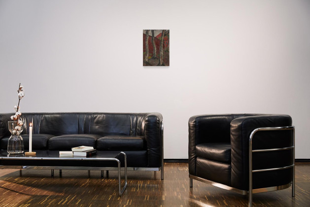 Um 1901 wird das vorliegende Gemälde datiert. Nach ihrem ersten Paris-Aufenthalt ist Paula Modersohn-Becker zurück im provinziell ländlichen Worpswede. In ihrer Arbeit verbindet Sie die abstrahierende, flächige Malweise, die sie in der französischen Metropole, speziell durch die Künstler des Nabis-Kreises kennenlernte mit den Themen ihrer direkten Umgebung. In dieser Zeit malt Paula überwiegend Landschaften. Die säulenhaften, angeschnittenen und so abstrakt gesehenen Birkenstämme sind ein häufig wiederkehrendes Motiv in ihren Arbeiten. Die flächenhafte Wiedergabe von Architektur, Erdboden und Himmel reduziert diese ganz auf die Farbe. Die erzielte Gleichwertigkeit der Bildelemente steigert di Atmosphäre auf subtile Art.