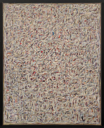 Aus unendlich vielen Lagen von Pinselstrichen hat Piero Dorazio dieses Gemälde gebaut. Auf den ersten Blick handelt es sich um ein chaotisches Flirren, um eine dicht gewebte All-Over-Struktur, die kein Ende findet und sich über den realen Bildrand hinaus weiterdenken lässt.