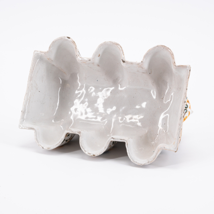 Technik: Sandfarbener Scherben mit weißer Glasur und Dekor in Gelb, Blau, Grün und dunklem Violett.