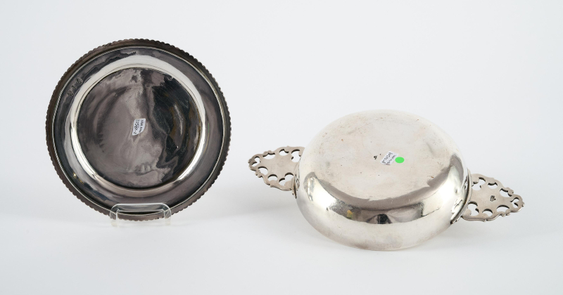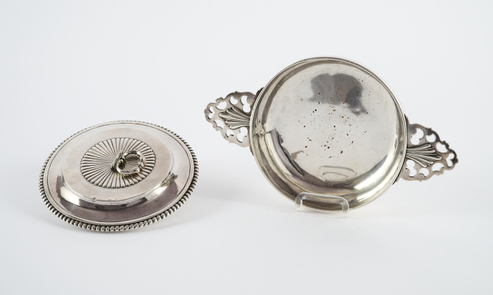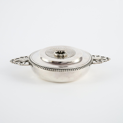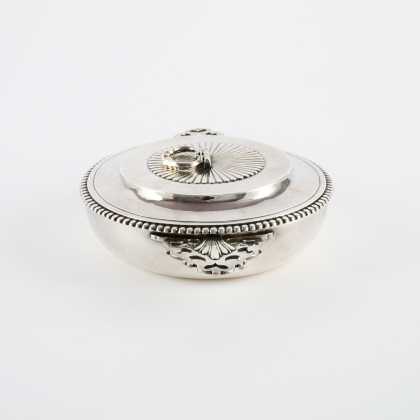 Beschreibung: Flache, runde Form mit kartuschenartigen, durchbrochenen Handhaben. Godronierter Rand und
