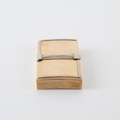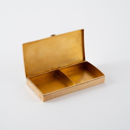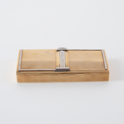 Beschreibung: Rechteckige Form mit leicht gewölbtem Boden und Deckel. Die Oberfläche guillochiert mit