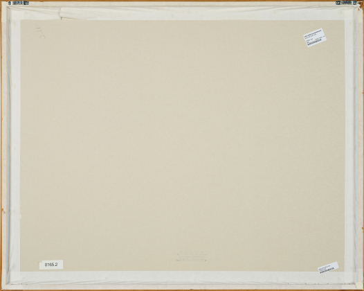Herstellungsbedingt leicht gewellt. Verso fest mit doppelseitigem Klebeband auf Rückwand geklebt. Ansonsten guter Zustand. Im Rahmen beschrieben.