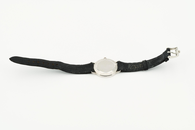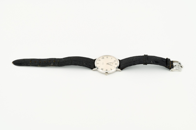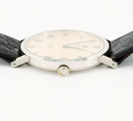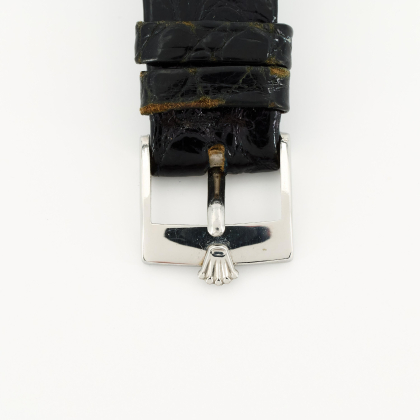 Gehäuse/Armband: 750/- Weißgold, Lederarmband mit Dornschließe, Zffbl. silbern, Zeiger und römische Ziffern schwarz.