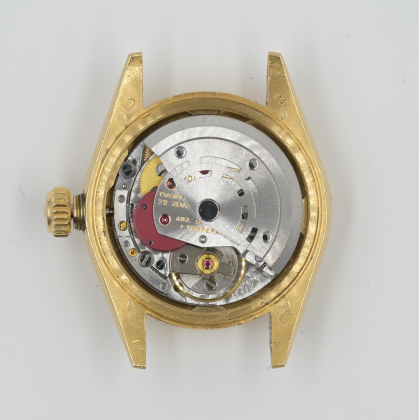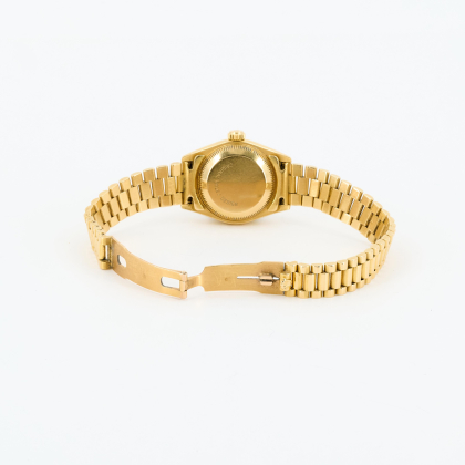Gehäuse/Armband: 750/- Gelbgold, Präsidentband mit Crownclasp, Zffbl. champagnerfarben, Zeiger golden, Diamantindizes, Leuchtmasse.