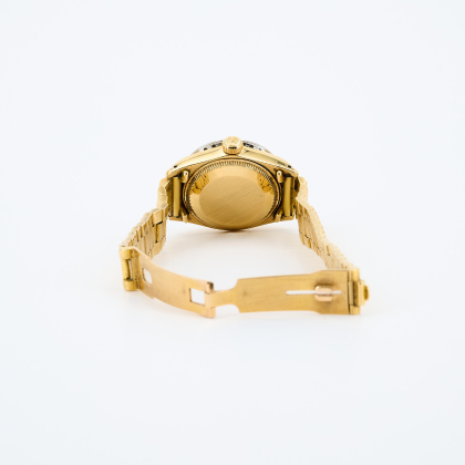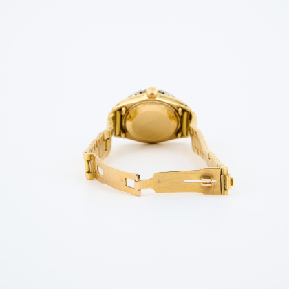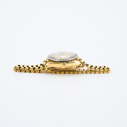 Gehäuse/Armband: 750/- Gelbgold mit Brillantbesatz, 32 Brillanten zus. ca. 0,32 ct., Zffbl. und Zeiger golden, Brillant Indizes, Leuchtmasse.