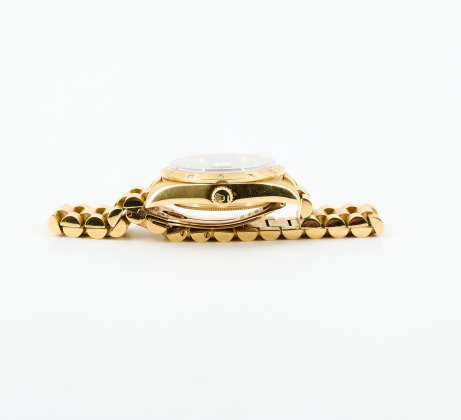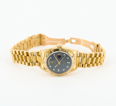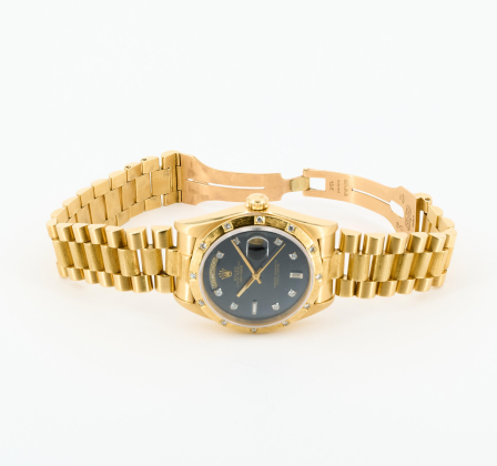 Gehäuse/Armband: 750/- Gelbgold, Bark-Finish besetzt mit 12 Brillanten zus. ca. 0,36 ct., Päsidentband mit Crownclasp, Zffbl. schwarz mit Diamant-Indizes, Zeiger golden, Leuchtmasse.