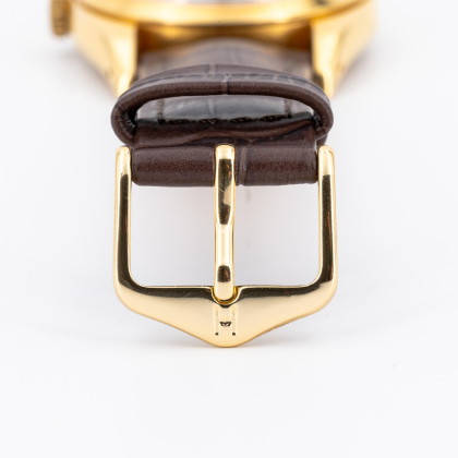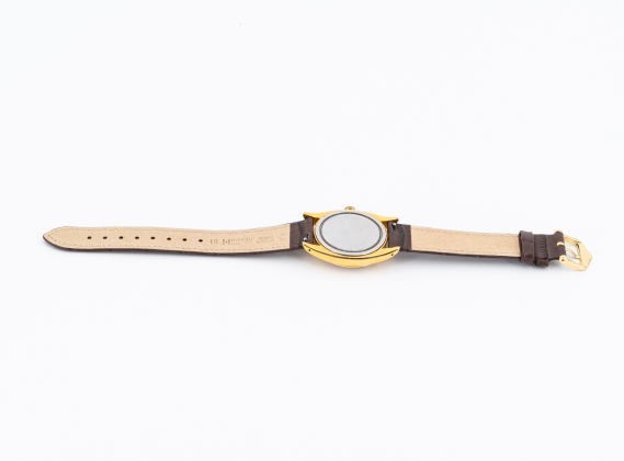 Gehäuse/Armband: Stahl vergoldet, Lederband mit Dornschließe, Zffbl. guillochiert-cremefarbend, Zeiger und Indizes golden.