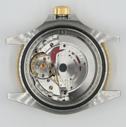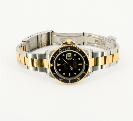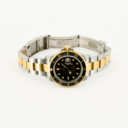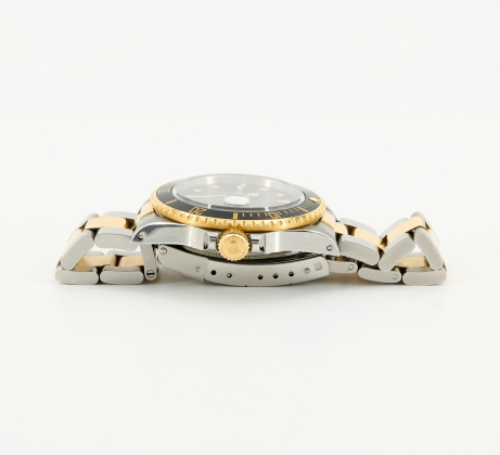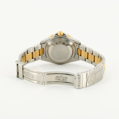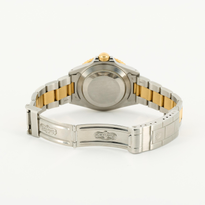 Gehäuse/Armband: Stahl, 750/- Gelbgold, Lünette mit Zahlenscheibe Aluminium eloxiert, Oysterband mit Faltschließe und Tauchverlängerung, Zffbl. schwarz, Zeiger und Indizes golden, Leuchtmasse.