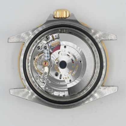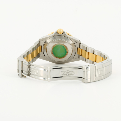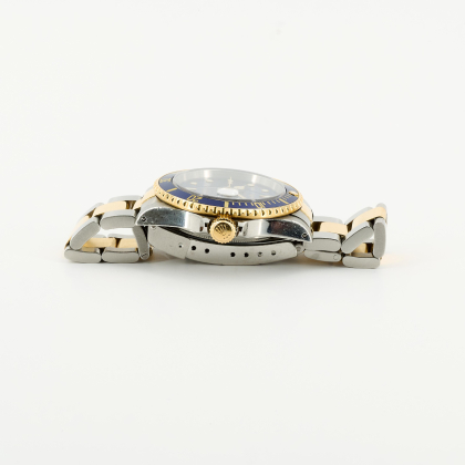 Gehäuse/Armband: Stahl, 750/- Gelbgold, Oysterband mit Sicherheitsfaltschließe, Zffbl. blau, Zeiger und Indizes golden, Leuchtmasse.
