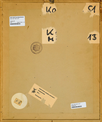 Zwei minimale Farbabplatzungen an der Oberkante rechts (jeweils ca. 0,1 x 0,1cm). Kleine Farbabplatzung oben mittig (ca. 0,2 x 0,4cm). Minimale Bestoßungen an der Oberkante. Minimaler Fingerabdruck oben mittig. Minimale Verschmutzungen und minimale Bereibungen an der Oberfläche. Ansonsten sehr guter Zustand. Verso montiert. Im Rahmen beschrieben.