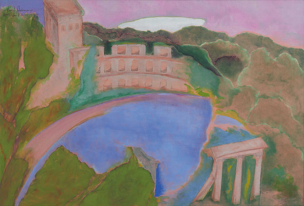 Das Gemälde "der Ruinenberg" von Sarah Schumann stammt aus dem Zyklus Sanssouci - Der Widerschein einer Erscheinung aus den Jahren 2012 und 2013. Die Pigmentmalerei auf Leinwand zeigt den berühmten normannischen Turm und die Theaterwand auf dem Ruinenberg mit einem kunstvoll arrangierten Wasserbecken und kolossalen Säulen. Die antikisierenden Staffagebauten inmitten des Landschaftsgartens zeigen die Faszination der Künstlerin an der Geschichte von Parkarchitektur.