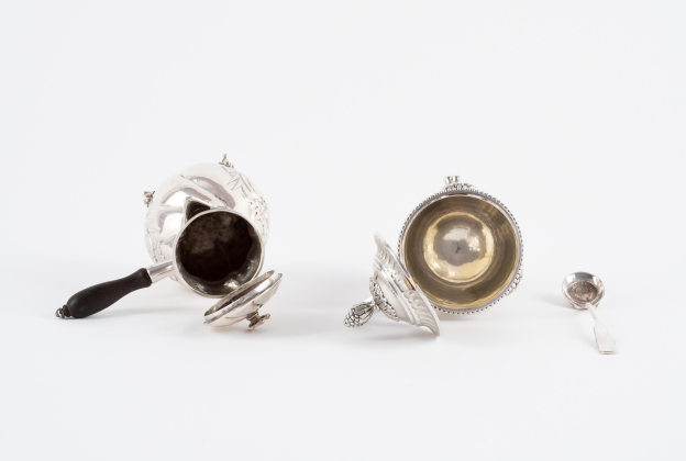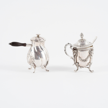 Los 348 | Senfgefäß mit Maskarons und kleines Stielkännchen mit bekrönter Kartusche
