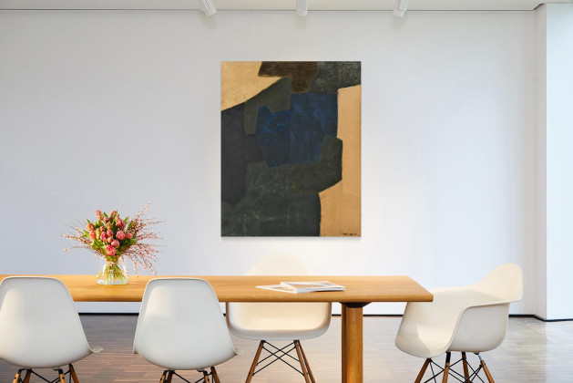 Auf den ersten Blick erinnert das Gemälde an die monumentalen Formen, die Serge Poliakoff in den letzten Jahren seines Lebens schuf. Eine mächtige dunkle Fläche mit Ausbuchtungen und Einkerbungen macht sich auf dem rechteckigen Bildgrund breit und lässt dem hellen Beige nur wenig Raum.