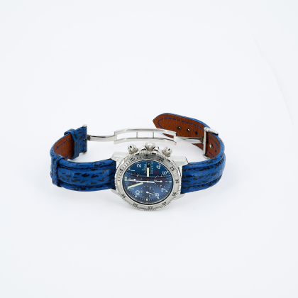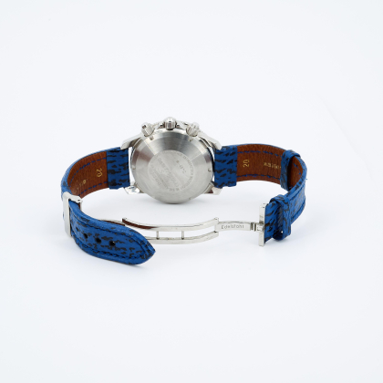 Gehäuse/Armband: Stahl, Lederarmband mit Doppelfaltschließe, Zffbl. blau, Zeiger weiß, arabische Ziffern weiß, Leuchtmasse.