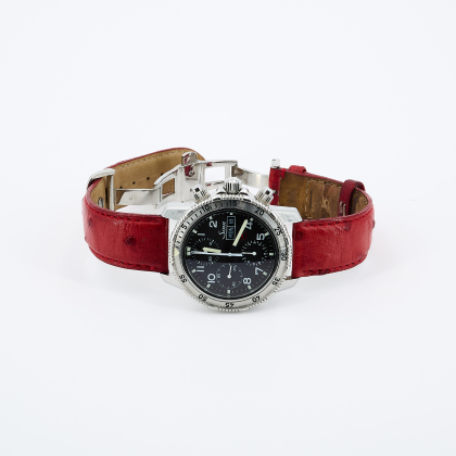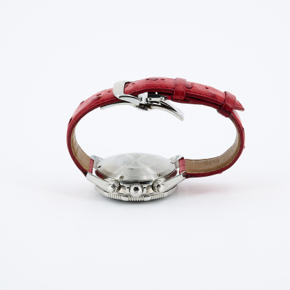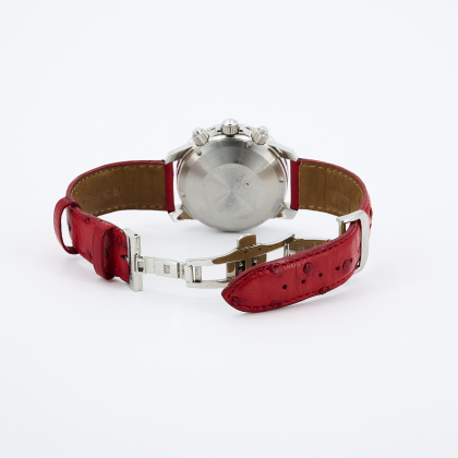 Beschreibung: 3-Zeiger-Chronograph, mit Datums- und Wochentagsanzeige bei "3" Uhr, 12-Stundenzähler bei "6" Uhr, dezentrale Sekunde bei "9" Uhr und 30-Minutenanzeige bei "12" Uhr.