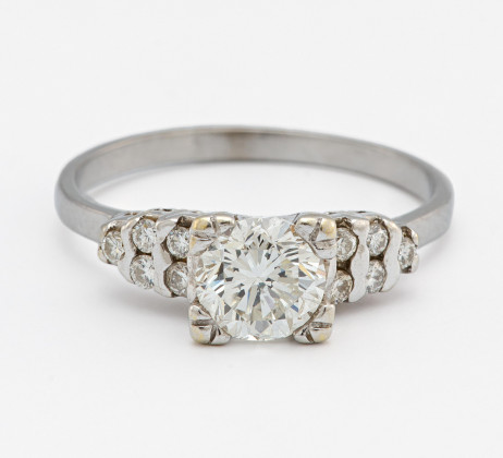 Diamanten: 1 Brillant ca. 0,8 ct., P1/I-J, 10 kleine Brillanten zus. ca. 0,1 ct.